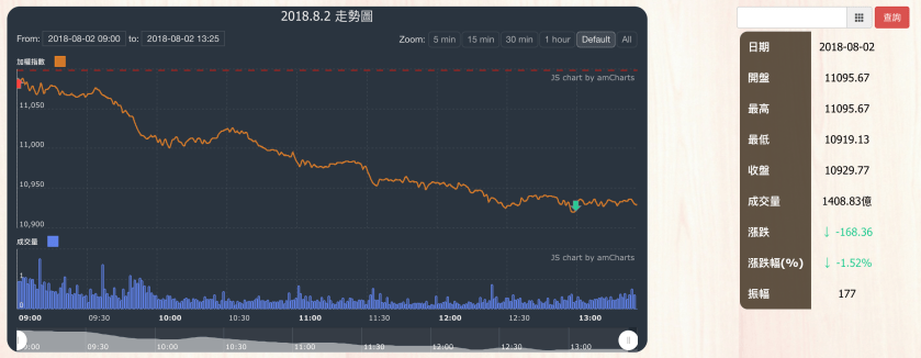 今日受中美貿易戰衝擊大盤加權指數收盤為10929.77,下跌168.36點,成交量1408.83億,當日盤勢呈現開盤低檔震盪至9:30後急速下跌,至尾盤都跌至最低檔,最後收跌168點;因今日的重挫使得目前盤勢已經跳脫之前預期的高檔震盪整理區間。