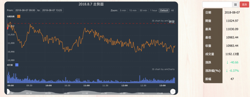 今日受台積電持續下跌影響,大盤加權指數收盤為10983,下跌40.66點,成交量1192.13億,成交量仍萎縮在1100多億。當日盤勢呈現上下震盪,至尾盤都在低檔震盪。
