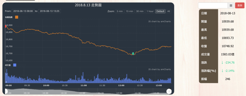 今日受美國與土耳其之間的貿易爭端引發恐慌性賣壓,大盤加權指數收盤為10748.92點,重挫234.76點,成交量放大至1583.03億。當日盤勢一開盤受到土耳其里拉重貶引發危機影響,大盤就下跌約百點,之後便在各權值股與其他中小型股持續重挫下,一路指數也呈現持續下跌走勢,盤中一度重挫高達279點,至尾盤再些微拉升至10748點。今日大盤可說是開低走低,盤中應有不少股票發生融資斷頭的賣壓,導致今日指數重挫。