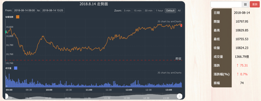 今日在昨日重挫的賣壓清洗完後進行反彈格局,大盤加權指數收盤為10824.23點,上漲75.31點(反彈約32%),成交量為1366.79億。當日盤勢一開盤仍是受到賣壓影響下跌至平盤附近,11:00之後便在各權值股與其他中小型股持續反彈下,一路指數也呈現持續上漲走勢,至尾盤再拉升至10824點。