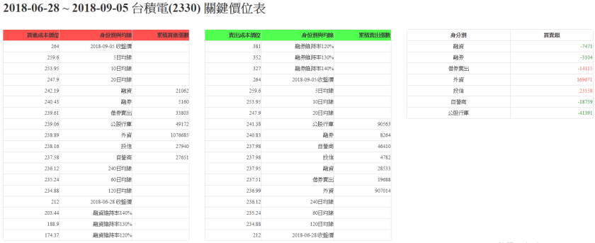我們選取近期台積電起漲點20180628至今日區間,進行關鍵價位分析(參考:https://www.stockdog.com.tw,其中功能:股狗心法中的關鍵價位分析),如下圖所示,最重要的外資買進成本為238.89,今日台積電收盤264,獲利約10.5%,外資買超部位約17萬張。