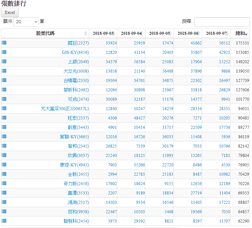 20180907認購權證買賣超排行 2018-09-07 stockdog168 權證每日資訊 發表留言 20180907權證買賣超排行 認購權證 在外流通量 張數排行為扣除自營商避險淨額後,計算淨流入/流出市場之張數。 金額排行為扣除發行商之買賣後,計算淨流入/流出市場之金額。 資料來源:https://www.stockdog.com.tw 買超排行: 賣超排行: 免責宣言 本網站文章所提供資訊僅供參考,並無任何推介買賣之意,投資人應自行承擔交易風險。 分享此文: 按一下即可分享至 X(在新視窗中開啟) X 按一下以分享至 Facebook(在新視窗中開啟) Facebook 喜歡 正在載入...