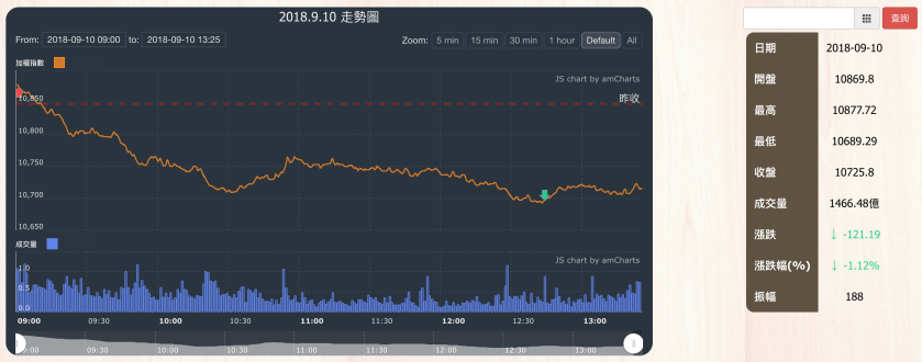 今日受中小型股下跌影響,大盤加權指數收盤為10725,下跌121.19點,成交量1466.48億,成交量持續放大約1460多億。當日盤勢開盤下跌至10:30有拉回,但因中小型股票及鴻海、大立光重挫下,至尾盤都在低檔震盪。