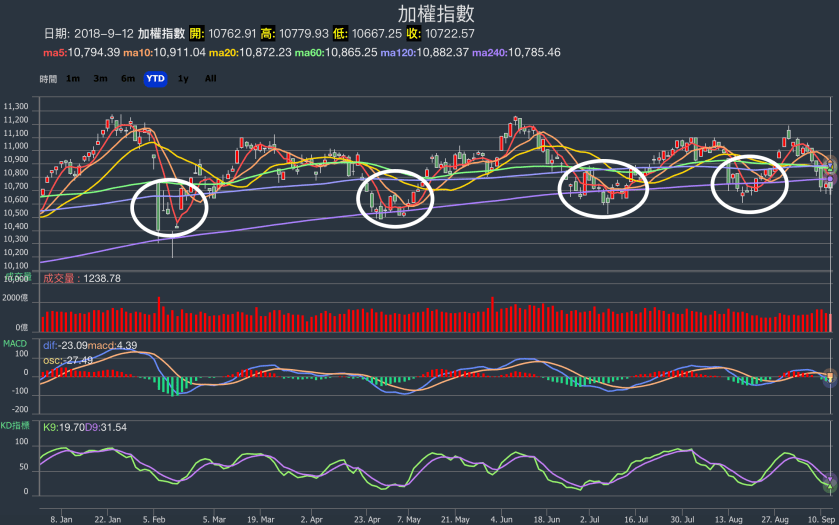 今日以技術面分析,指數收盤仍跌破5、20、60、120、240均線都跌破。指標部分 : KD指標往下跌,而MACD目前還在0軸上;目前前波低點10606是短線支撐;選擇權的OI 區間今日又擴至在[10500-11200]區間,區間700點,今日是持續測試底部支撐。依據今年的波動慣性統計,底部測試的天數(白色圈圈)約5-15天的期間,目前指數仍在測試底部支撐階段;但也不能排除直接跌破前波低點下跌走勢的可能性,畢竟外資現在的期貨加選擇權及台灣50反部位是偏空的,只能說目前先觀察支撐能否站穩,不宜持有大部位操作是較佳的策略。