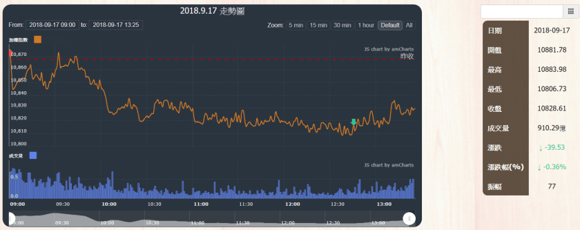 今日受台積電、大立光、台塑化回檔影響,大盤加權指數收盤為10828,下跌39.53點,成交量910.29億,成交量萎縮。當日盤勢開盤至9:30之後往下回測10820,指數在低檔持續震盪,至尾盤拉回。
