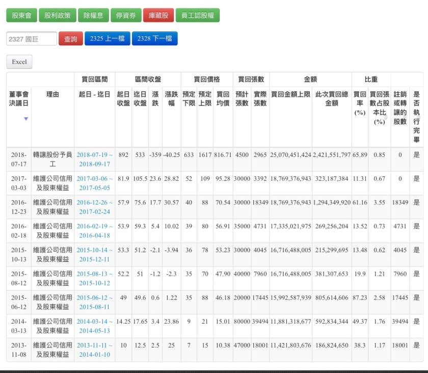 20180918國巨庫藏股結束 2018-09-18 stockdog168 個股分析 發表留言 國巨公告今年實施庫藏股概況,已買回2,965張,執行率65.88%,高於歷次庫藏股執行進度,每張均價816.71元,買回庫藏股總斥資24.21億元。 國巨在8月9日公告累計買回庫藏股為2,965張,此也代表著在這之後,國巨股價低於720元,公司就未再買進庫藏股,主要進出券商為「群益金鼎新店」,可參考下表,在庫藏股執行期間買進2873張,買超2267張,買進均價為786.53元。 免責宣言 本網站文章所提供資訊僅供參考,並無任何推介買賣之意,投資人應自行承擔交易風險。 分享此文: 按一下即可分享至 X(在新視窗中開啟) X 按一下以分享至 Facebook(在新視窗中開啟) Facebook 喜歡 正在載入...