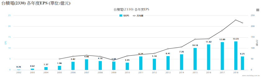 以台積電為例,於104~107年幾乎每季都有平均2-3.5元左右的EPS,可認為該股每月、每季、每年的EPS在過去幾年內持續成長可預期,若累積4季【EPS】皆維持在13.5元,以本益比18倍計算,股價243元會有很大的基本面支撐。