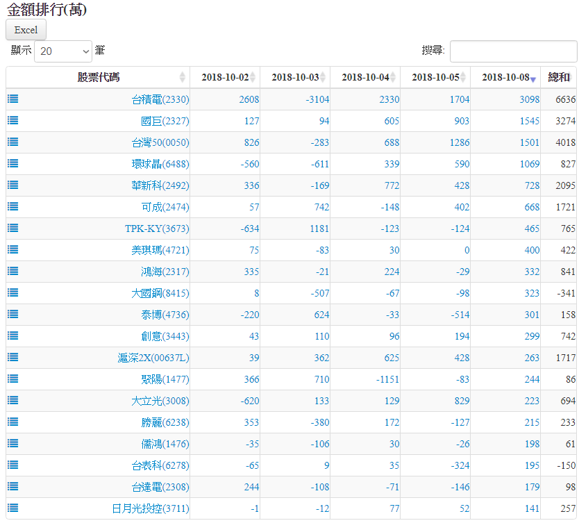 20181008認購(售)權證標的買賣超排行 2018-10-08 stockdog168 權證每日資訊 發表留言 權證在外流通量 1.張數排行為扣除自營商避險淨額後,計算淨流入/流出市場之張數。 2.金額排行為扣除發行商之買賣後,計算淨流入/流出市場之金額。 資料來源:https://www.stockdog.com.tw 認購權證標的買超排行: 認購權證標的賣超排行: 認售權證標的買超排行: 認售權證標的賣超排行: 免責宣言 本網站文章所提供資訊僅供參考,並無任何推介買賣之意,投資人應自行承擔交易風險。 分享此文: 按一下即可分享至 X(在新視窗中開啟) X 按一下以分享至 Facebook(在新視窗中開啟) Facebook 喜歡 正在載入...