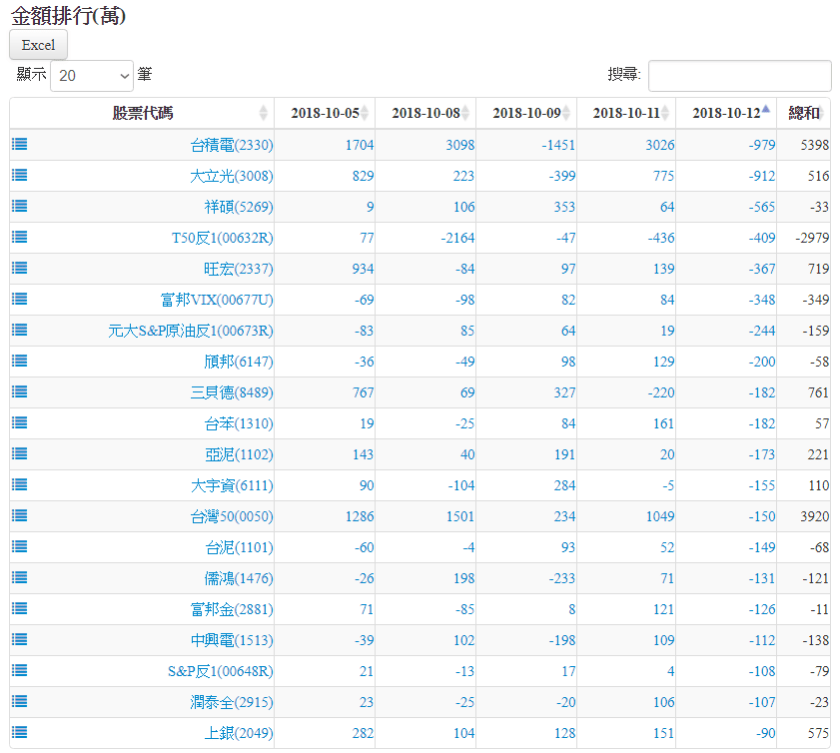 20181012認購(售)權證標的買賣超排行 2018-10-12 stockdog168 權證每日資訊 發表留言 權證在外流通量 1.張數排行為扣除自營商避險淨額後,計算淨流入/流出市場之張數。 2.金額排行為扣除發行商之買賣後,計算淨流入/流出市場之金額。 資料來源:https://www.stockdog.com.tw 認購權證標的買超排行: 認購權證標的賣超排行: 認售權證標的買超排行: 認售權證標的賣超排行: 免責宣言 本網站文章所提供資訊僅供參考,並無任何推介買賣之意,投資人應自行承擔交易風險。 分享此文: 按一下即可分享至 X(在新視窗中開啟) X 按一下以分享至 Facebook(在新視窗中開啟) Facebook 喜歡 正在載入...