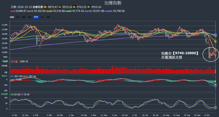今日以技術面分析,指數今日持續跌破5、10、20、60、120、240日均線,均線來看已經是空頭走勢。指標部分 : KD指標初步黃金交叉,但在低檔震盪,而MACD在0軸之下;指數持續在【9740-10000】測試支撐力道。