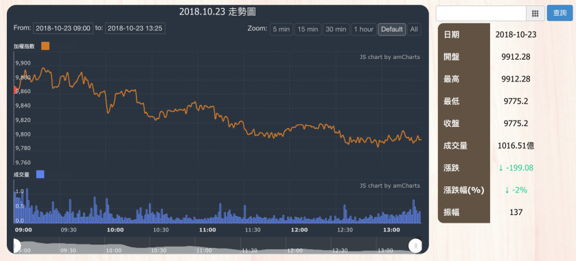 今日大盤在大陸股市又重挫及權值台塑化、台積電又重挫影響下指數又重挫,大盤加權指數收盤為9775.2,下跌199.08點,成交量為1016.51億元。當日盤勢開低盤後持續下跌,而之後在權值股台積電往下重挫,指數直接往下貫壓,直到尾盤收在最低點。