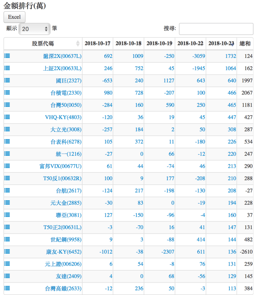 20181023認購(售)權證標的買賣超排行 2018-10-23 stockdog168 權證每日資訊 發表留言 權證在外流通量 1.張數排行為扣除自營商避險淨額後,計算淨流入/流出市場之張數。 2.金額排行為扣除發行商之買賣後,計算淨流入/流出市場之金額。 資料來源:https://www.stockdog.com.tw 【認購權證標的】買超排行: 【認購權證標的】賣超排行: 【認售權證標的】買超排行: 【認售權證標的】賣超排行: 免責宣言 本網站文章所提供資訊僅供參考,並無任何推介買賣之意,投資人應自行承擔交易風險。 分享此文: 按一下即可分享至 X(在新視窗中開啟) X 按一下以分享至 Facebook(在新視窗中開啟) Facebook 喜歡 正在載入...