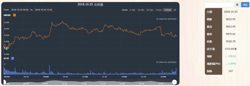 今日大盤在美股下跌及權值台積電外資賣超影響下,大盤加權指數收盤為9520.79,重挫238.6點,成交量為1315.81億元。當日盤勢開低盤下跌後,在權值股台積電緩慢往上拉升下,指數緩步減少跌幅,直到尾盤在賣壓影響下仍重挫238點。