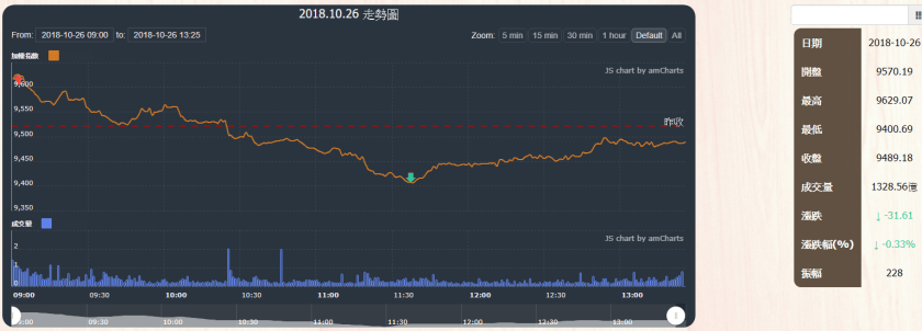 今日大盤在美股反彈及權值台塑化下跌影響下,大盤加權指數收盤為9489.18,下跌31.61點,成交量為1328.56億元。當日盤勢開高盤後在賣壓湧現後下跌,11:30在權值股台積電緩慢往上拉升下,指數緩步減少跌幅,直到尾盤在賣壓影響下仍下跌31點。