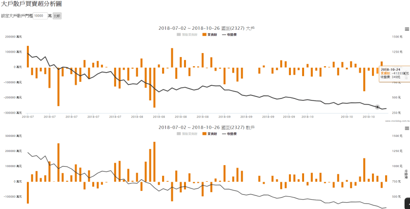 Step 4:選取【籌碼面】=>【細部籌碼】=>【區間籌碼比對】,透過【大戶散戶買賣超分析圖】來分析【大戶】【散戶】買賣超狀況,如下圖所示,國巨在下跌區間(2018/7/2-2018/10/26),以大戶散戶門檻【1億】元為分界點,顯示【大戶】都是處於賣超較多狀態,【散戶】是處於買超較多狀態,籌碼結構不佳。