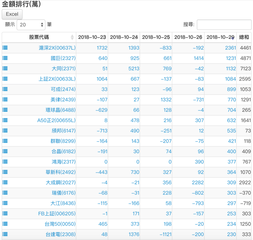 20181029認購(售)權證標的買賣超排行 2018-10-29 stockdog168 權證每日資訊 發表留言 權證在外流通量 1.張數排行為扣除自營商避險淨額後,計算淨流入/流出市場之張數。 2.金額排行為扣除發行商之買賣後,計算淨流入/流出市場之金額。 資料來源:https://www.stockdog.com.tw 【認購權證標的】買超排行: 【認購權證標的】賣超排行: 【認售權證標的】買超排行: 【認售權證標的】賣超排行: 免責宣言 本網站文章所提供資訊僅供參考,並無任何推介買賣之意,投資人應自行承擔交易風險。 分享此文: 按一下即可分享至 X(在新視窗中開啟) X 按一下以分享至 Facebook(在新視窗中開啟) Facebook 喜歡 正在載入...
