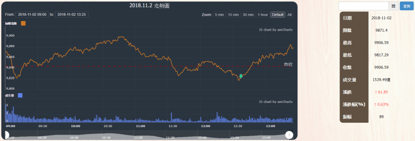 今日大盤在權值股與被動元件大漲帶動下,大盤加權指數收盤為9906.59,上漲61.85點,成交量為1539.49億元。當日盤勢開盤回跌測試後在權值股與被動元件帶動下,指數全面性上漲,直到尾盤上漲61點。