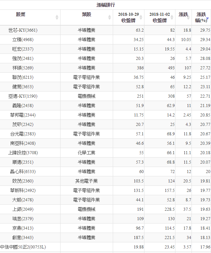 20181029-1102本周上漲、下跌股排行 2018-11-04 stockdog168 選股條件 發表留言 利用股狗網【漲跌幅】功能可以統計本周漲幅、跌幅的個股 1.股狗網 https://www.stockdog.com.tw 2.選取【個股排行】=>【技術面】=>【漲跌幅】 【上市】 【上櫃】 免責宣言 本網站文章所提供資訊僅供參考,並無任何推介買賣之意,投資人應自行承擔交易風險。 分享此文: 按一下即可分享至 X(在新視窗中開啟) X 按一下以分享至 Facebook(在新視窗中開啟) Facebook 喜歡 正在載入...