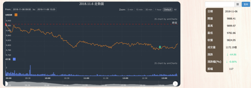 今日大盤在權值股大立光、被動元件國巨、華新科下跌下,大盤加權指數收盤為9824.95,下跌64.86點,成交量為1172.19億元。當日盤勢在權值股持續下跌下,指數震盪回檔,直到尾盤下跌64點。