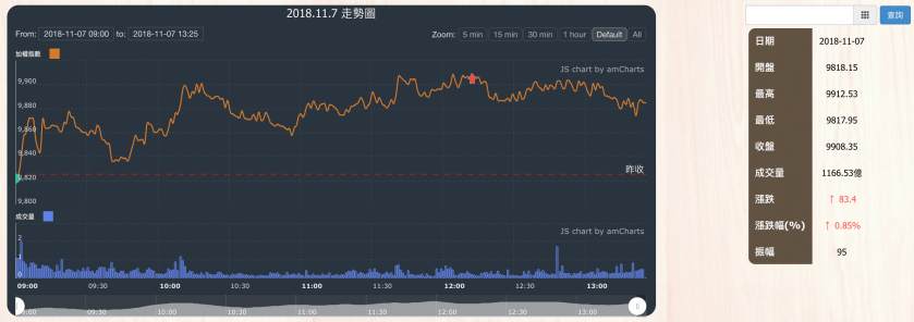 今日大盤在被動元件國巨、華新科大漲下,大盤加權指數收盤為9908.35,上漲83.4點,成交量為1166.53億元。當日盤勢開盤上漲然後隨美國選舉結果漸漸明朗下,指數慢慢反彈上漲,直到尾盤上漲83點。