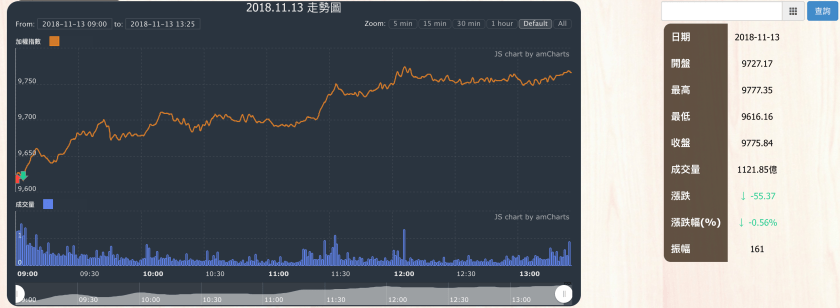 今日大盤受美股及蘋果重挫影響,大盤加權指數收盤為9775.84,下跌55.37點,成交量為1121.85億元。當日盤勢開低後在權值股台積電、台塑化下跌緩升下,指數從開盤重挫200多點緩步拉升,直到尾盤收下跌55點。