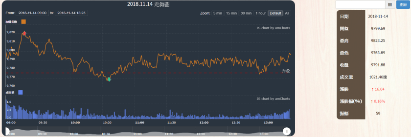 今日大盤受台積電、台塑化漲跌互見影響下,大盤加權指數收盤為9791.88,上漲16.04點,成交量為1021.46億元。當日盤勢開低後在權值股台積電、台塑化漲跌互見下,指數從開盤開高後回測平盤,直到尾盤又拉回上漲16點。