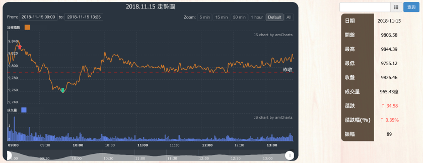 今日大盤受台積電、大立光漲跌互見影響下,大盤加權指數收盤為9826.46,上漲34.58點,成交量為965.43億元。當日盤勢開低後在權值股台積電、台塑化漲跌互見下,指數從開盤開高後回測平盤,直到尾盤又拉回上漲34點。