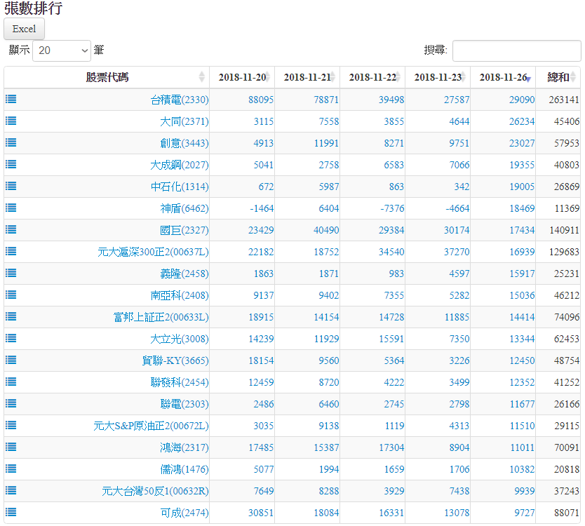 20181126認購(售)權證標的買賣超排行 2018-11-26 stockdog168 權證每日資訊 發表留言 權證在外流通量 1.張數排行為扣除自營商避險淨額後,計算淨流入/流出市場之張數。 2.金額排行為扣除發行商之買賣後,計算淨流入/流出市場之金額。 資料來源:https://www.stockdog.com.tw 【認購權證標的】買超排行: 【認購權證標的】賣超排行: 【認售權證標的】買超排行: 【認售權證標的】賣超排行: 免責宣言 本網站文章所提供資訊僅供參考,並無任何推介買賣之意,投資人應自行承擔交易風險。 分享此文: 按一下即可分享至 X(在新視窗中開啟) X 按一下以分享至 Facebook(在新視窗中開啟) Facebook 喜歡 正在載入...