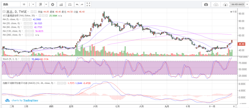 從本益比來看,嘉晶目前的本益比32.05偏高。