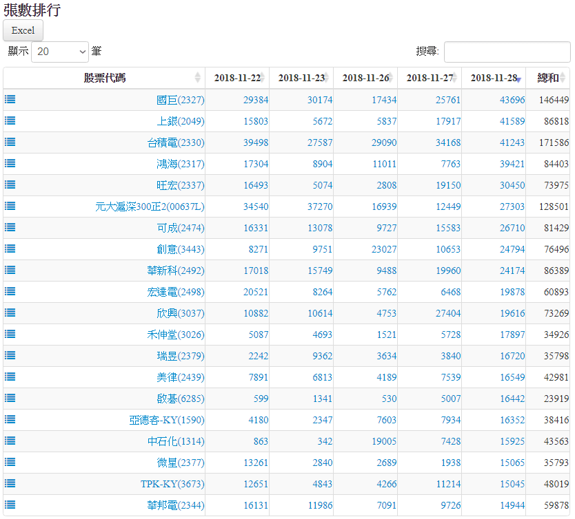 20181128認購(售)權證標的買賣超排行 2018-11-28 stockdog168 權證每日資訊 發表留言 權證在外流通量 1.張數排行為扣除自營商避險淨額後,計算淨流入/流出市場之張數。 2.金額排行為扣除發行商之買賣後,計算淨流入/流出市場之金額。 資料來源:https://www.stockdog.com.tw 【認購權證標的】買超排行: 【認購權證標的】賣超排行: 【認售權證標的】買超排行: 【認售權證標的】賣超排行: 免責宣言 本網站文章所提供資訊僅供參考,並無任何推介買賣之意,投資人應自行承擔交易風險。 分享此文: 按一下即可分享至 X(在新視窗中開啟) X 按一下以分享至 Facebook(在新視窗中開啟) Facebook 喜歡 正在載入...