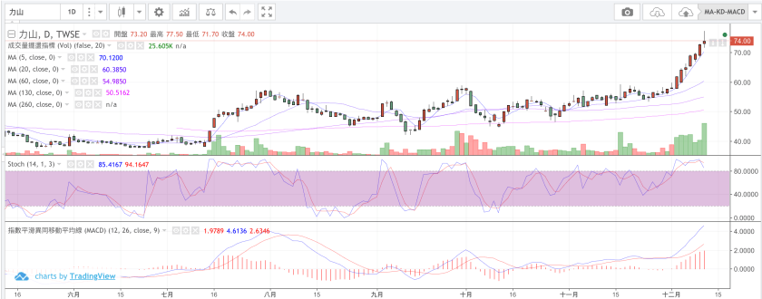 今日收盤價站上各均線,KD黃金交叉向上在高檔震盪,MACD在0軸上方持續上漲;技術面看有機會繼續往上。