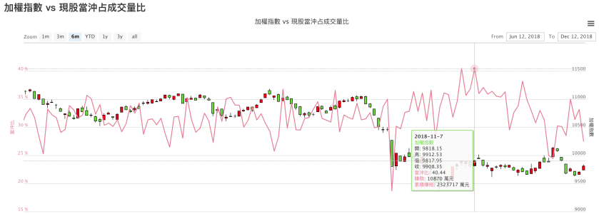 證交所昨(12)日公布,11月集中市場當沖成交值占比衝高至34.55%,較10月占比31.58%大增近4個百分點,創歷史單月新高;平均每日當沖戶數51,774戶,也大幅高於10月的48,061戶。