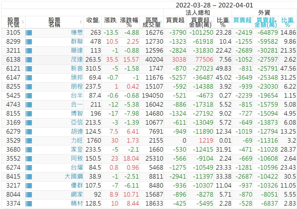 【上櫃外資賣超個股】(以金額排行,單位:萬)