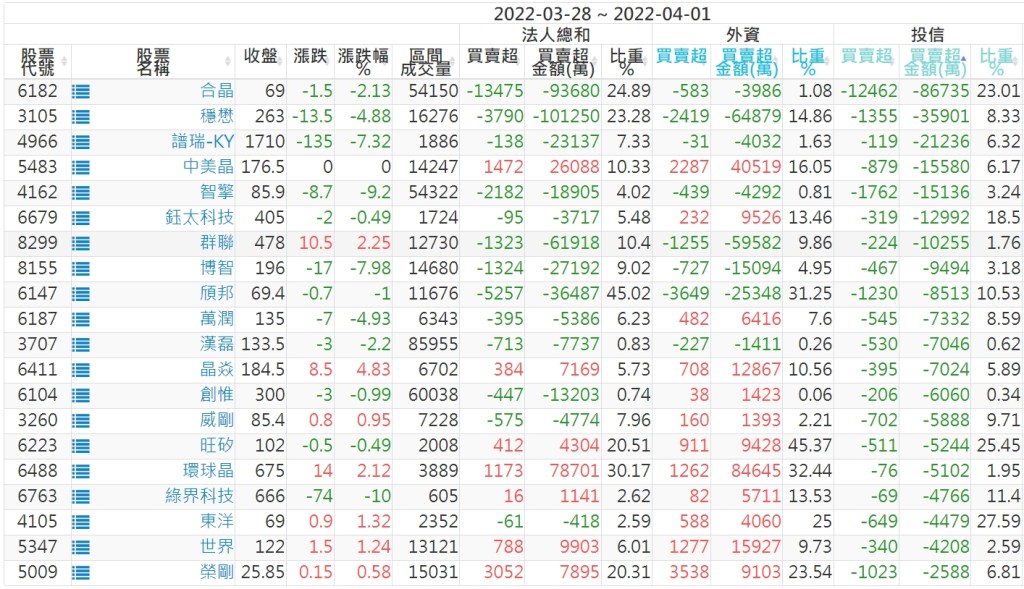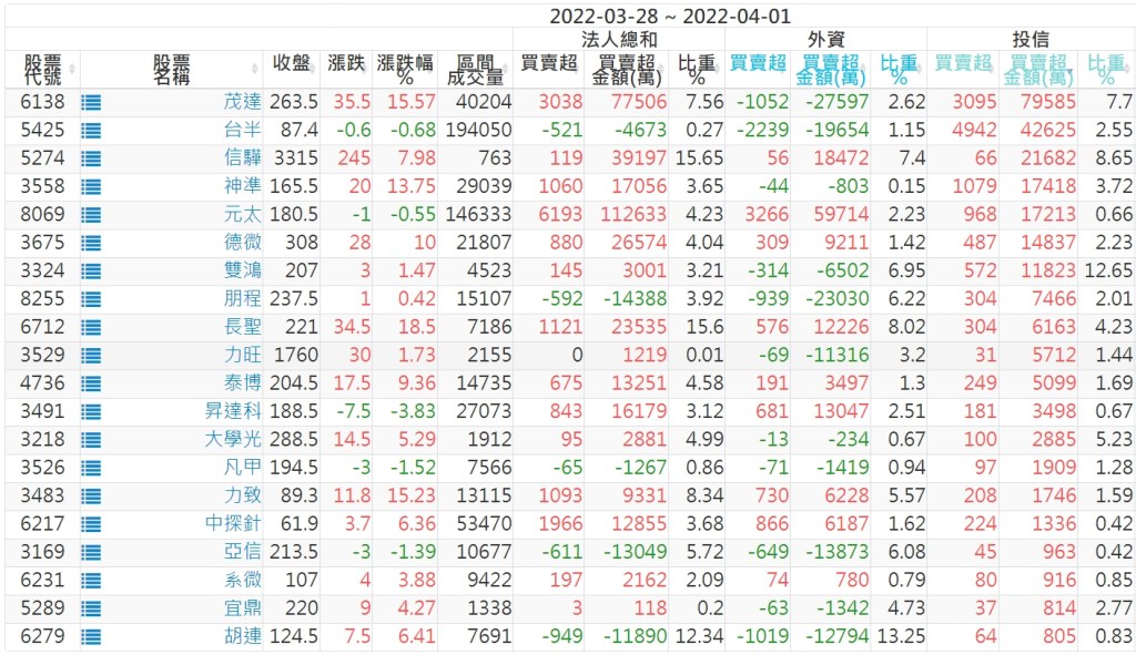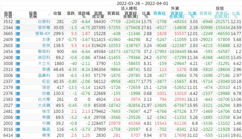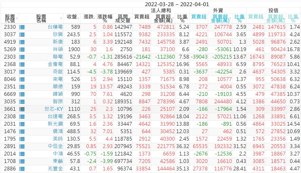 2022/03/28~2022/04/01近5日【投信】買賣超個股