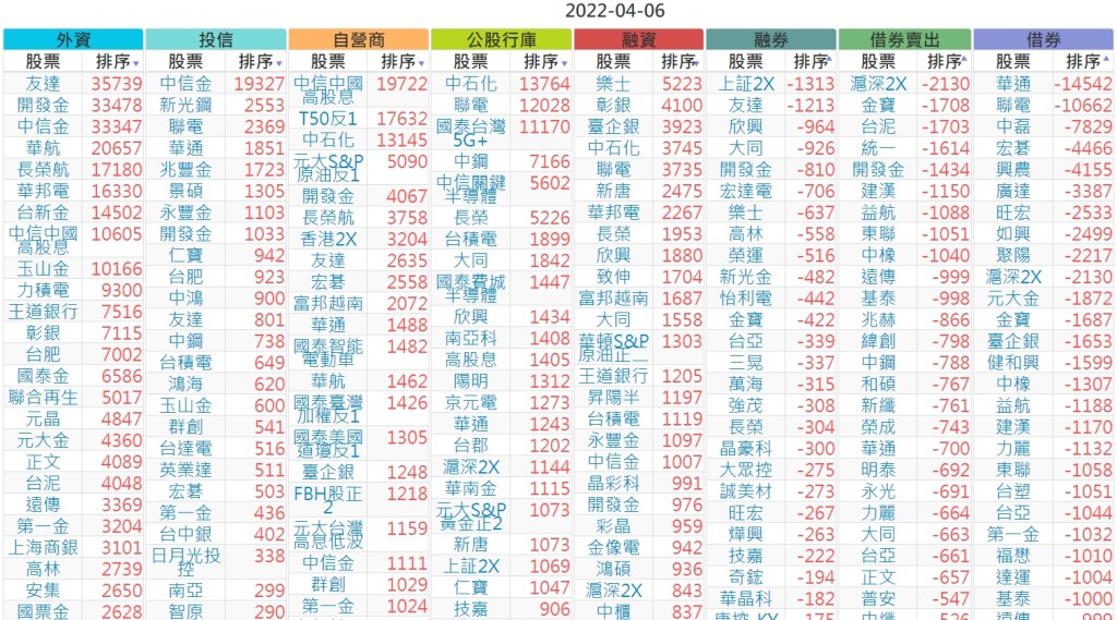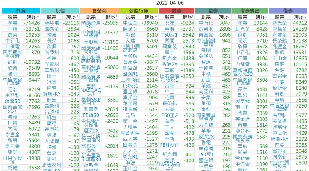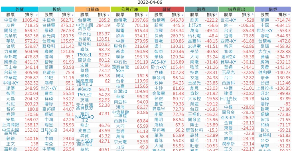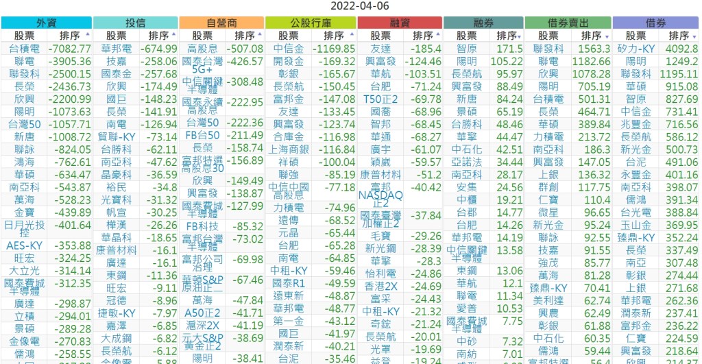 上市:【外資、投信】賣超(依張數)   (單位:張數)