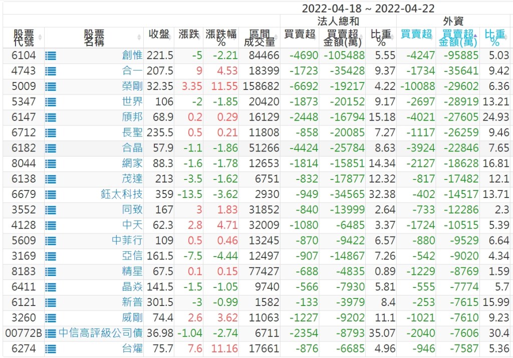 【上櫃外資賣超個股】(以金額排行,單位:萬)
