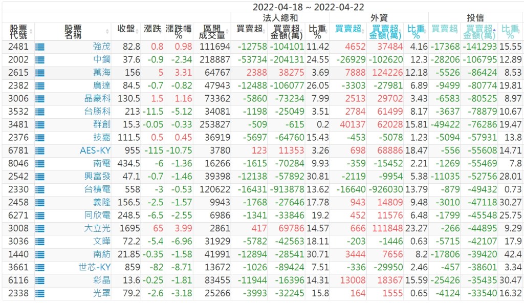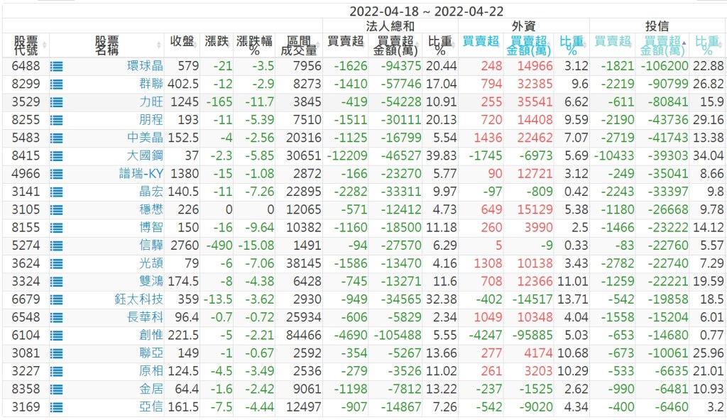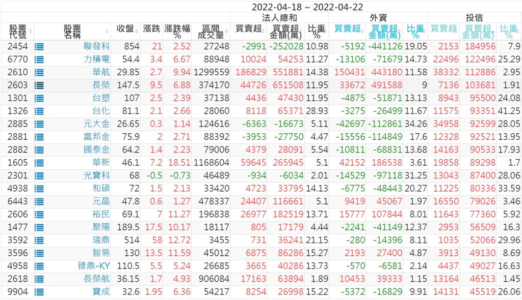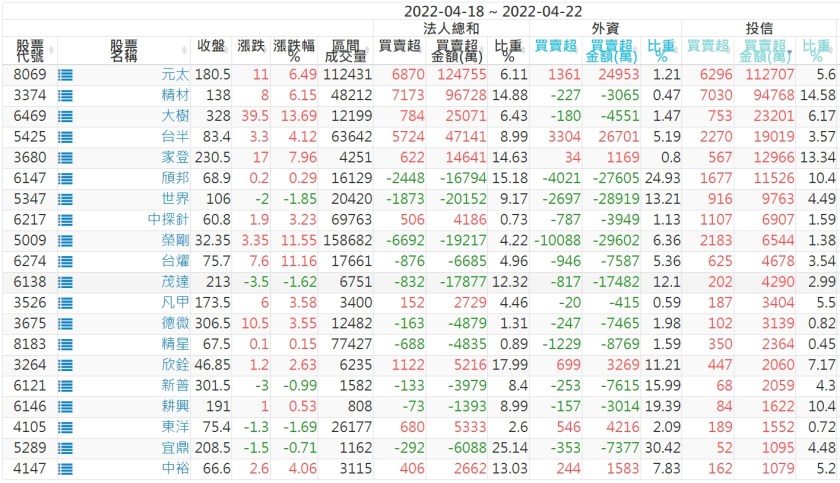 2022/04/18~2022/04/22近5日【投信】買賣超個股