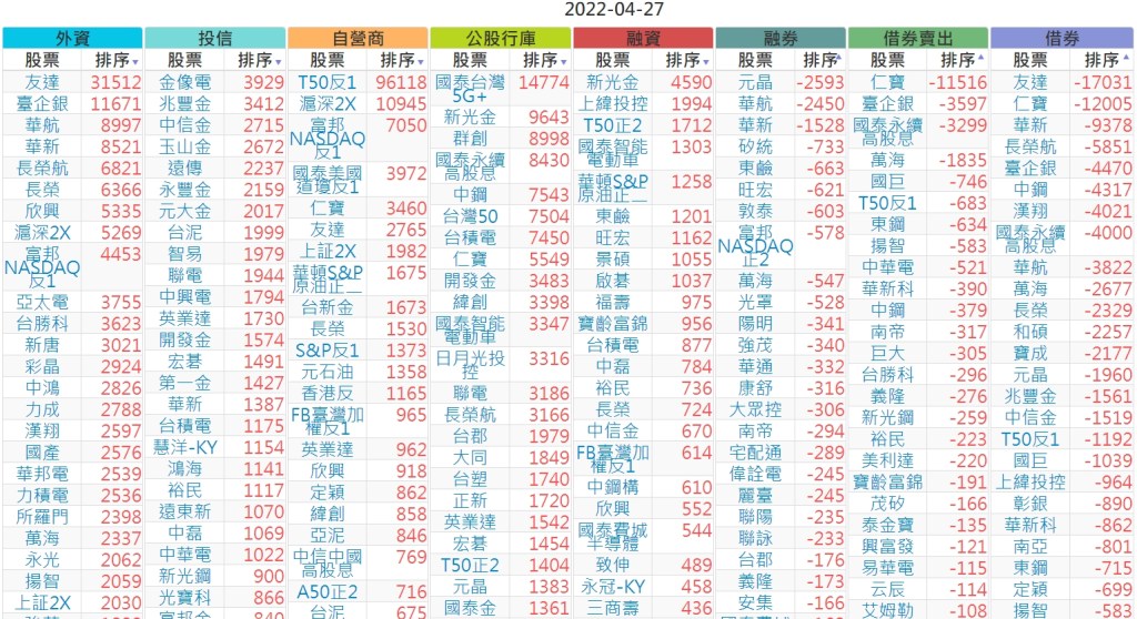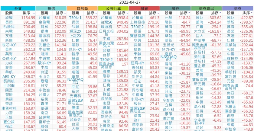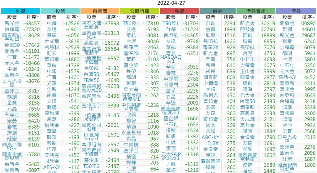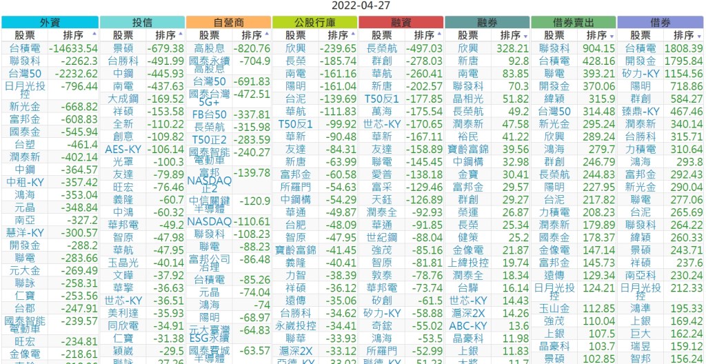 上市:【外資、投信】賣超(依張數)   (單位:張數)