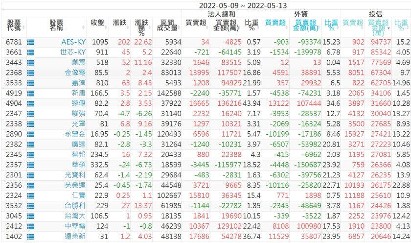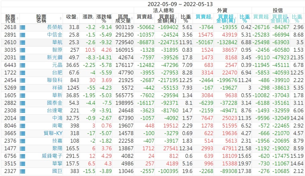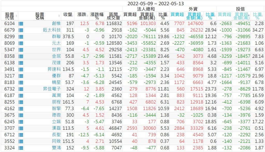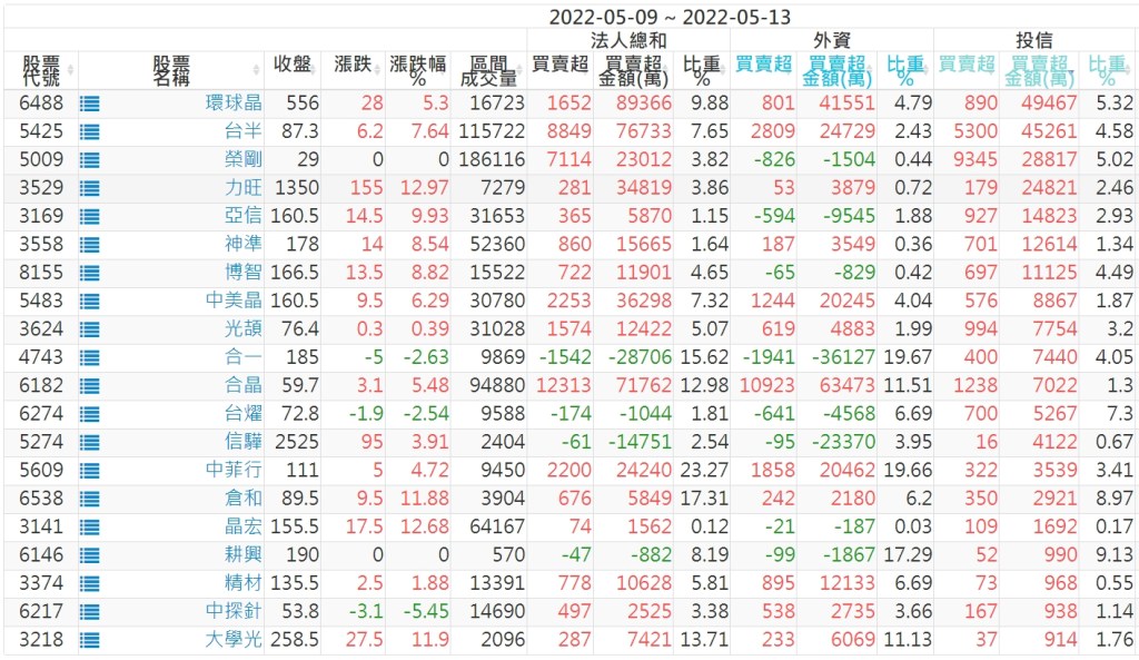 2022/05/09~2022/05/13近5日【投信】買賣超個股