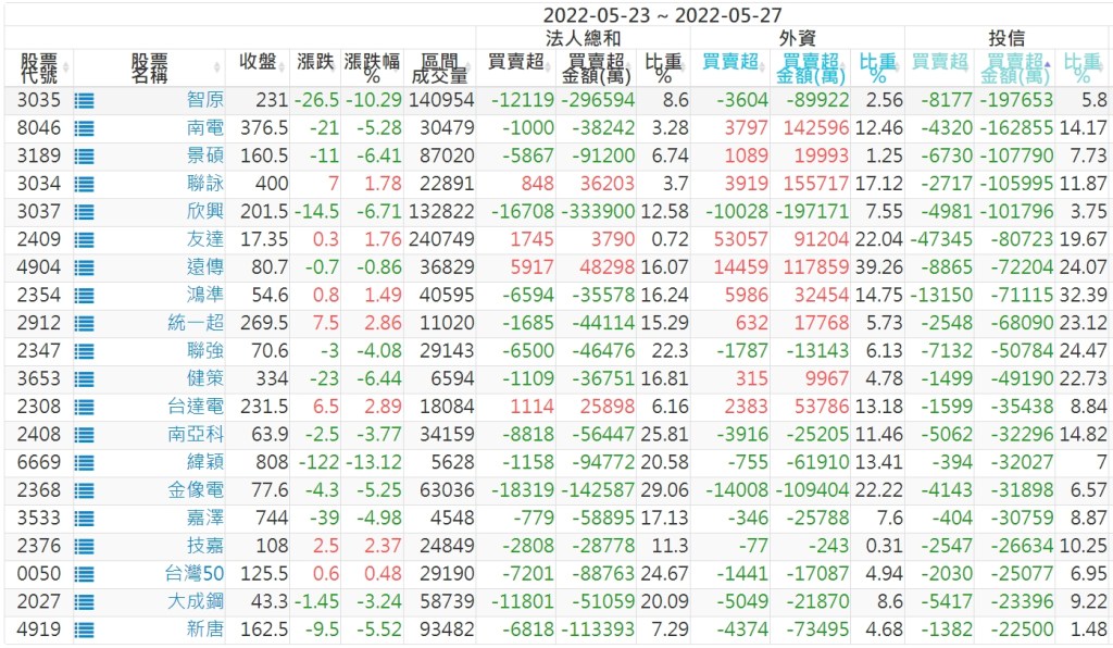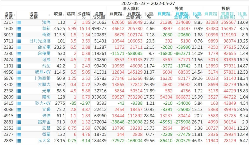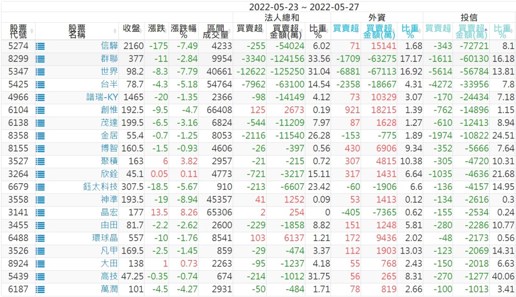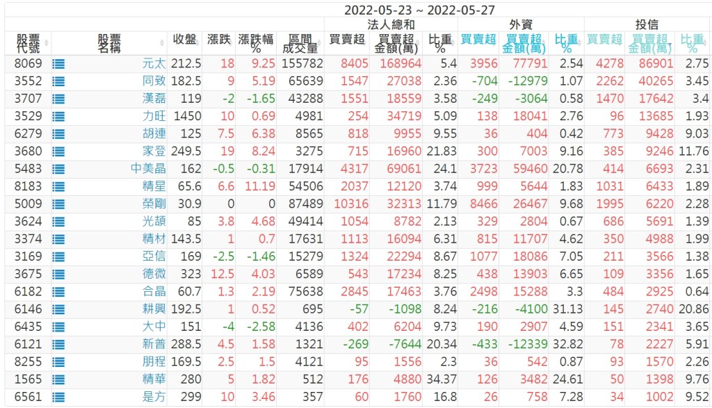 2022/05/23~2022/05/27近5日【投信】買賣超個股