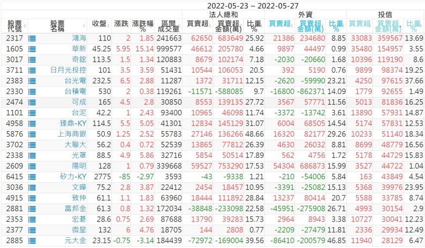 2022/05/23~2022/05/27近5日【投信】買賣超個股
