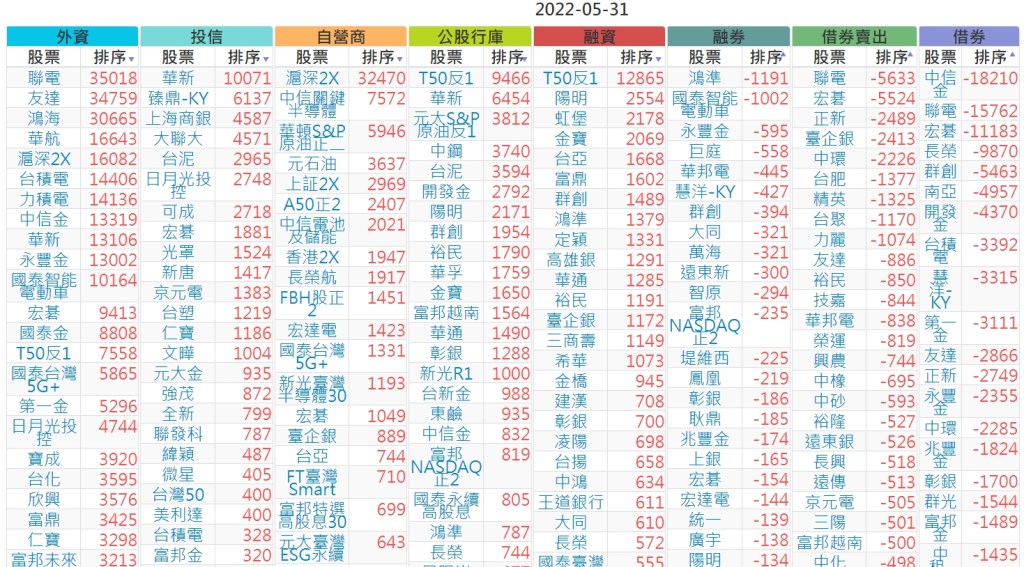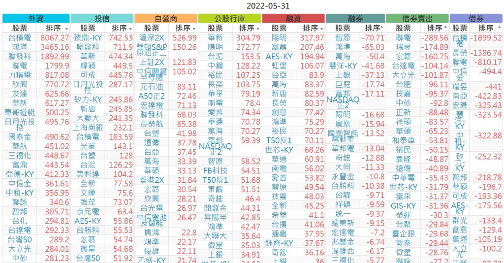 上市:【外資、投信】賣超(依張數) (單位:張數)