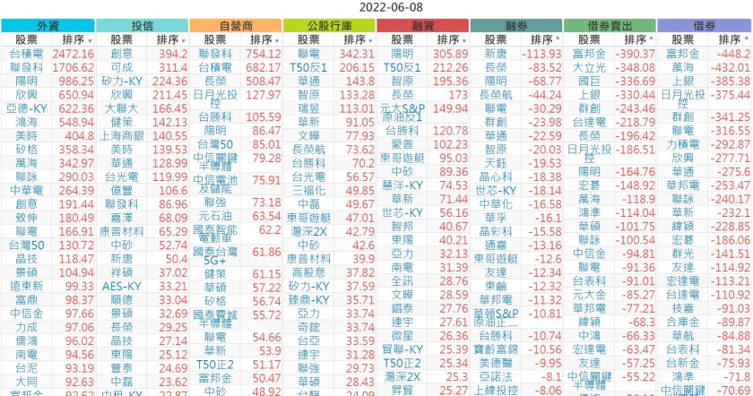 上市:【外資、投信】賣超(依張數)   (單位:張數)