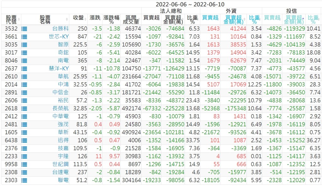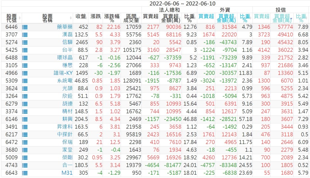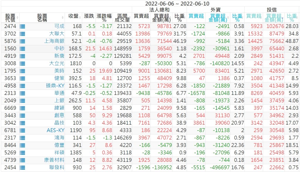 2022/06/06~2022/06/10近5日【投信】買賣超個股