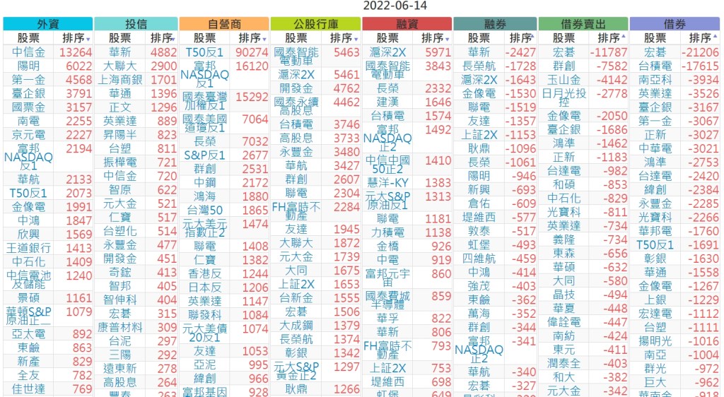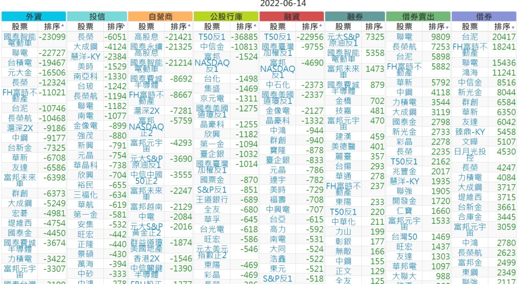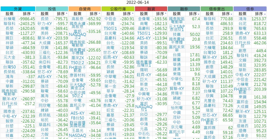 上市:【外資、投信】賣超(依張數)   (單位:張數)
