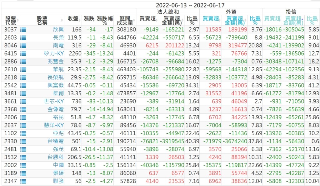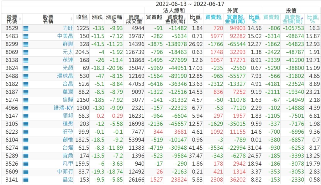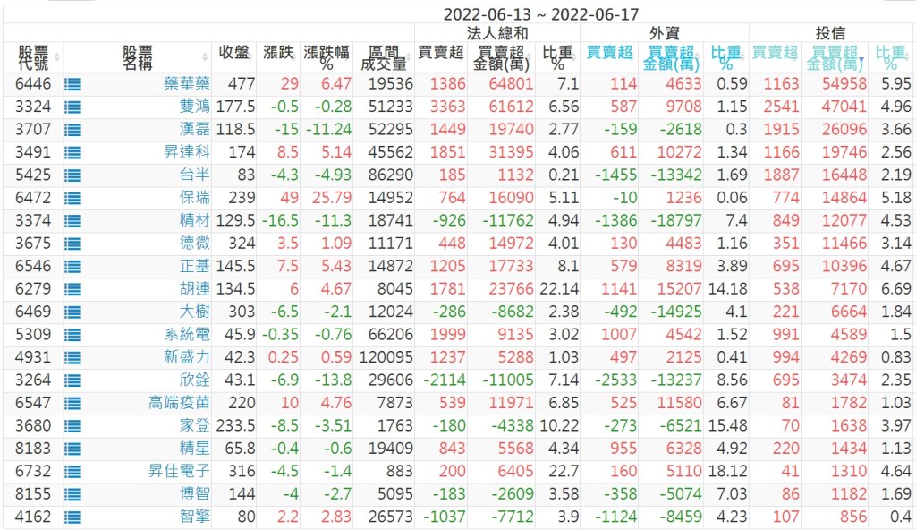 2022/06/13~2022/06/17近5日【投信】買賣超個股