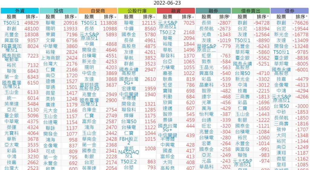 上市:【外資、投信】賣超(依張數)   (單位:張數)