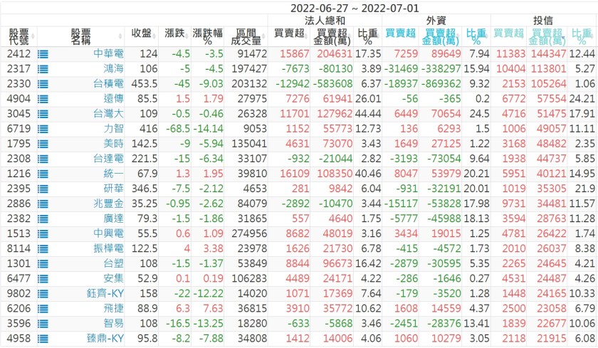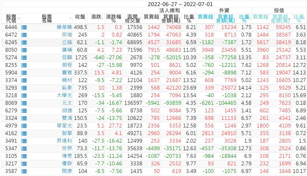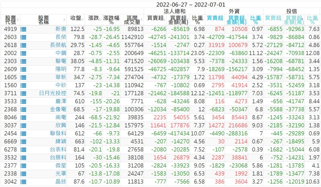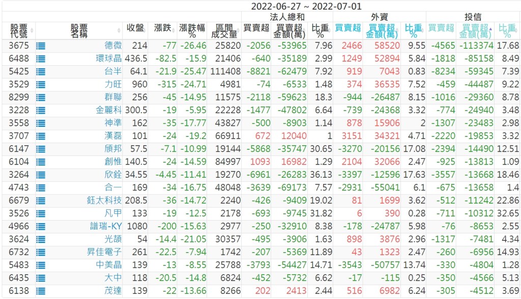 2022/06/27~2022/07/01近5日【投信】買賣超個股