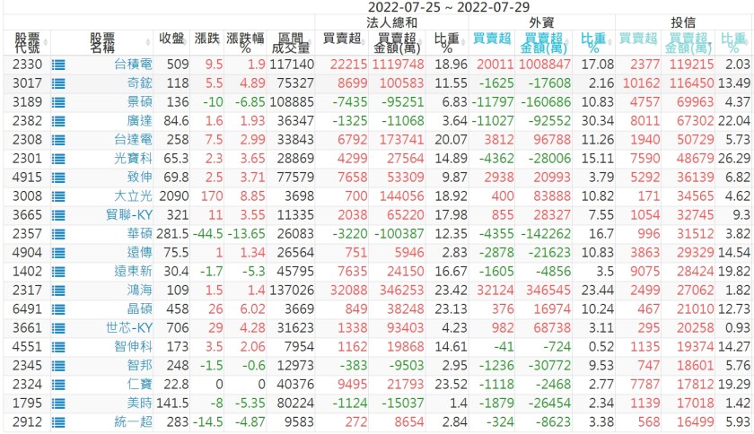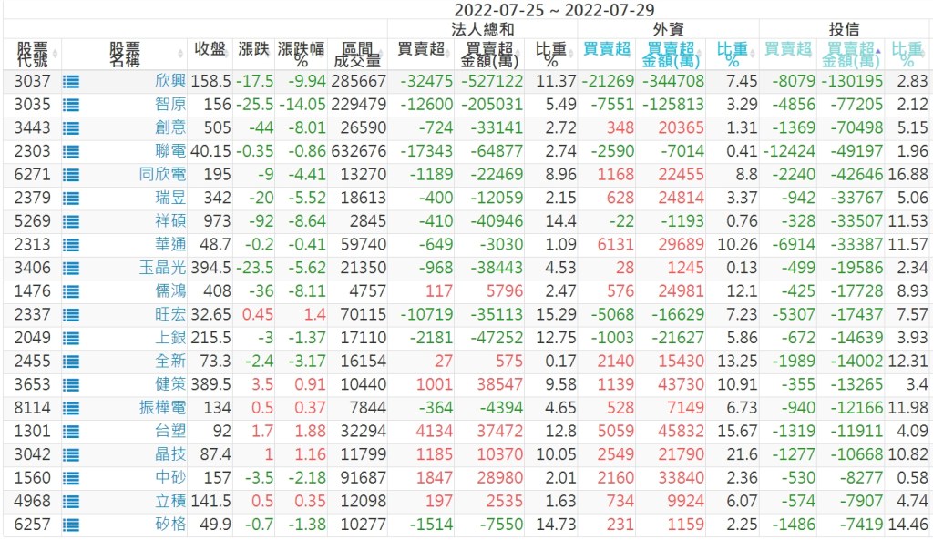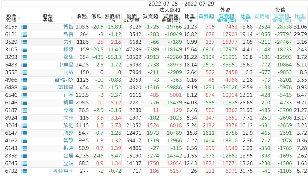 2022/07/25~2022/07/29近5日【投信】買賣超個股