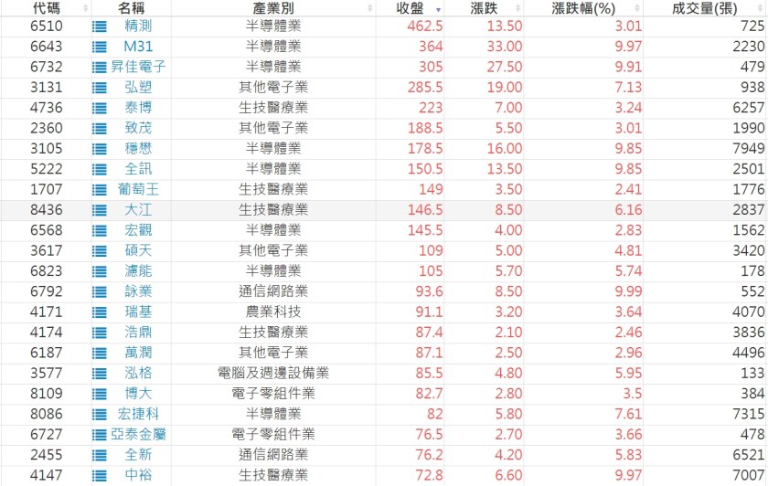 2022-0831股價創20日新高爆量上漲股 2022-09-01 股狗網小編 選股條件 發表留言 投資達人APP上線囉!!!『安裝APP』: 利用股狗選股的選股條件可以【挑選突破20日新高,爆量上漲起漲點股票】 1.股狗選股 https://www.stockdog.com.tw 2.選股條件: a.收盤價創20日新高 b.當日漲幅 > 2% 免責宣言 本網站文章所提供資訊僅供參考,並無任何推介買賣之意,投資人應自行承擔交易風險。 分享此文: 按一下即可分享至 X(在新視窗中開啟) X 按一下以分享至 Facebook(在新視窗中開啟) Facebook 喜歡 正在載入...